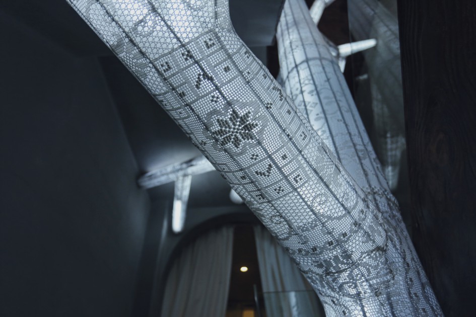 《树德坊的树》是艺术家刘毅为树德坊内的民宿空间创作的灯光艺术作品。灵感来源于艺术家对老上海生活片段的回忆,以及对于“树”这一生命体的敬意。作品“树”的枝干生长在建筑内各个空间中,传统钩针编织工艺花布的绚丽图案丰富了树的表皮,透过会呼吸的光与此空间呢喃对话。