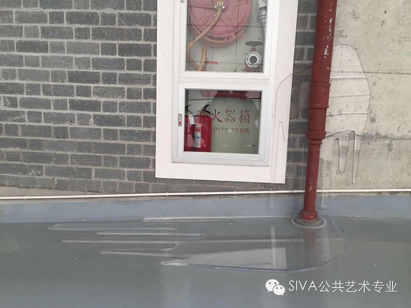 我想利用透明亚克力这种树脂材料在校园实训中心一楼电梯旁的消防管道做一滩透明的水迹景观来营造公共空间的氛围。此雕塑作品在具有观赏性的同时让观者可以自己去触碰感受水,体验并感知日常中所忽视的事物,并且是对校园的生态环境产生思考,营造一种区域特有的空间意境。