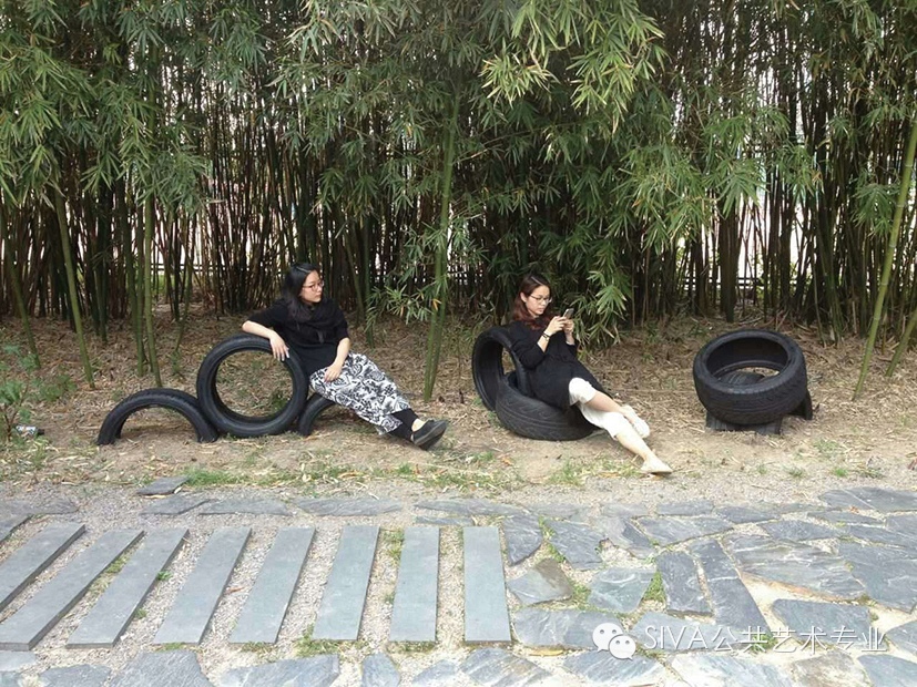 作品是通过废弃轮胎切割重新拼接组装成造型各异的公共设施座椅,同时也可做雕塑观赏。作品材料由使用过的汽车废弃轮胎为主体,轮胎内用镶嵌钢丝,使底座受力稳定,在轮胎断面之间通过螺丝固定位置。运用废弃材料制作公共艺术作品来宣扬废物再利用的节能环保理念。