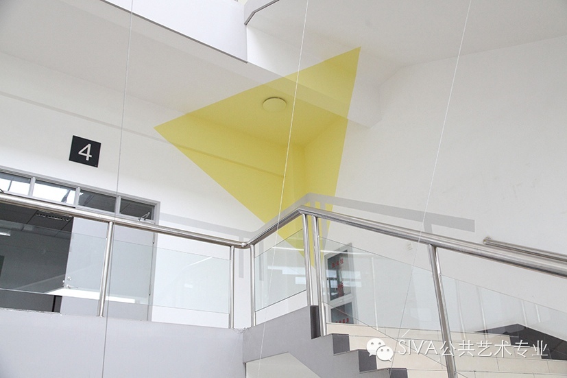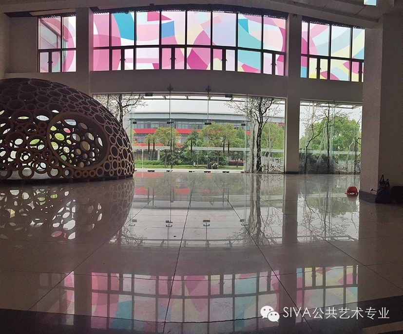 根据调查发现,学生和老师对于逸飞楼大厅的色彩普遍感觉单调。作品想通过彩色透明膜的材质,增加逸飞楼大厅的色彩,并通过阳光的照射在地面上倒影出色彩,赋予其生命。适当明亮的色彩便会给人的视觉感官一种强烈的刺激,激发人的神经细胞,给学生在每天的学习生活注入能量。