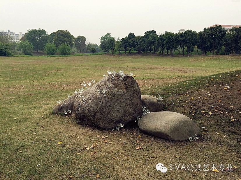石头,本身是毫无生命的物体,开出美丽的花朵,寓意着理想与坚持。玻璃,就像生命一样脆弱的材质,与石头的结合形成鲜明的对比,并模糊了空间与自然的界限,透过光创造出虚拟之境。同时引起人们对平常景观的注视,形成艺术与公共环境互生互利的良好关系。