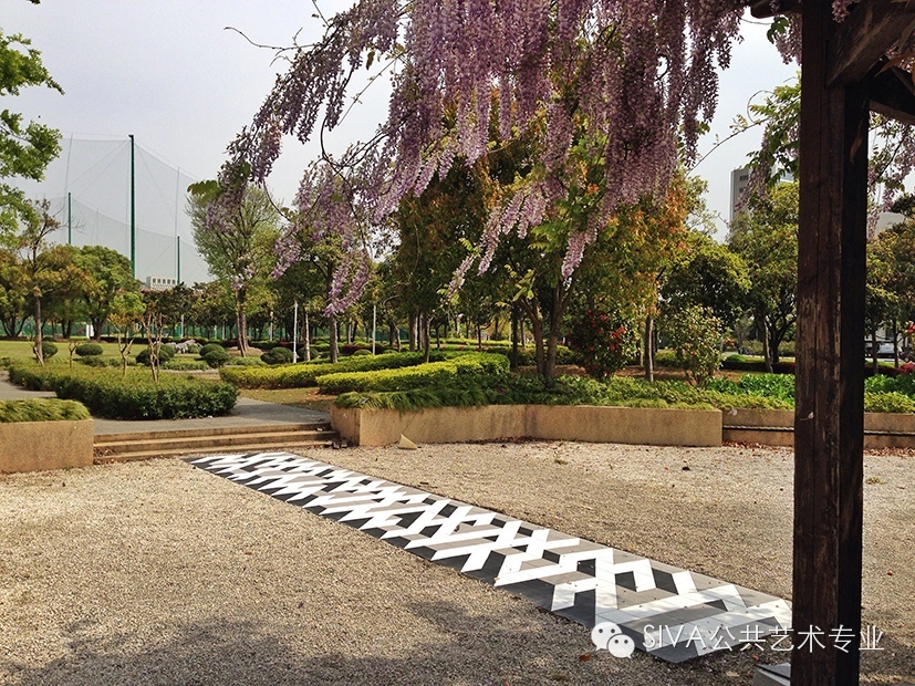 探索适合现代审美趣味的花园迷宫的艺术形式。在静谧、优雅的逸飞楼紫藤花园中,以平面形式绘制3D的迷宫通道。极富装饰性的几何语言搭配黑、白、灰的简洁色调,在白色沙石的烘托下,增显了紫藤花园的高雅,同时赋予一抹淘气。