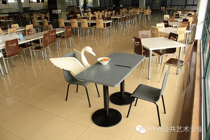 作品以虚拟情景的形式进行呈现,以玻璃钢材料塑造天鹅造型,外表光滑细腻、细节处理深入,桌椅与天鹅形成黑白灰关系,在食堂环境中又会显得不同但又不会过于杂乱,将天鹅与人进行角色的互换,以食堂这个地点为媒介,表达了人想通过别人的帮助而非自身努力而获得成功的心态,与天鹅不愿低头吃面前那碗面却要等对面有别人来帮它夹喂它的情景不谋而合。在增添了平时用餐时的趣味性之外,还能够及时的提醒同学们等待别人的帮助远不如自身努力。