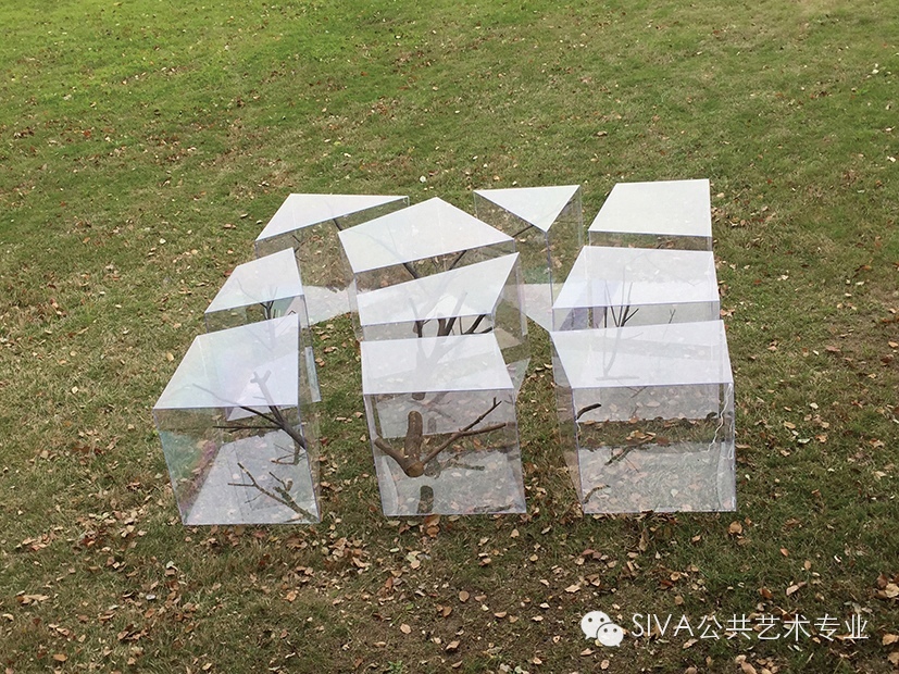 利用木头与透明材料的差异和对比,通过装置手法将材料有机地组合在一起,体现传统与现代的完美结合。作品放置于校园公共空间环境之中,让大家置身其中时不但能体验雕塑的独特魅力,更能引发对传统与现代这对矛盾体的认识与思考。