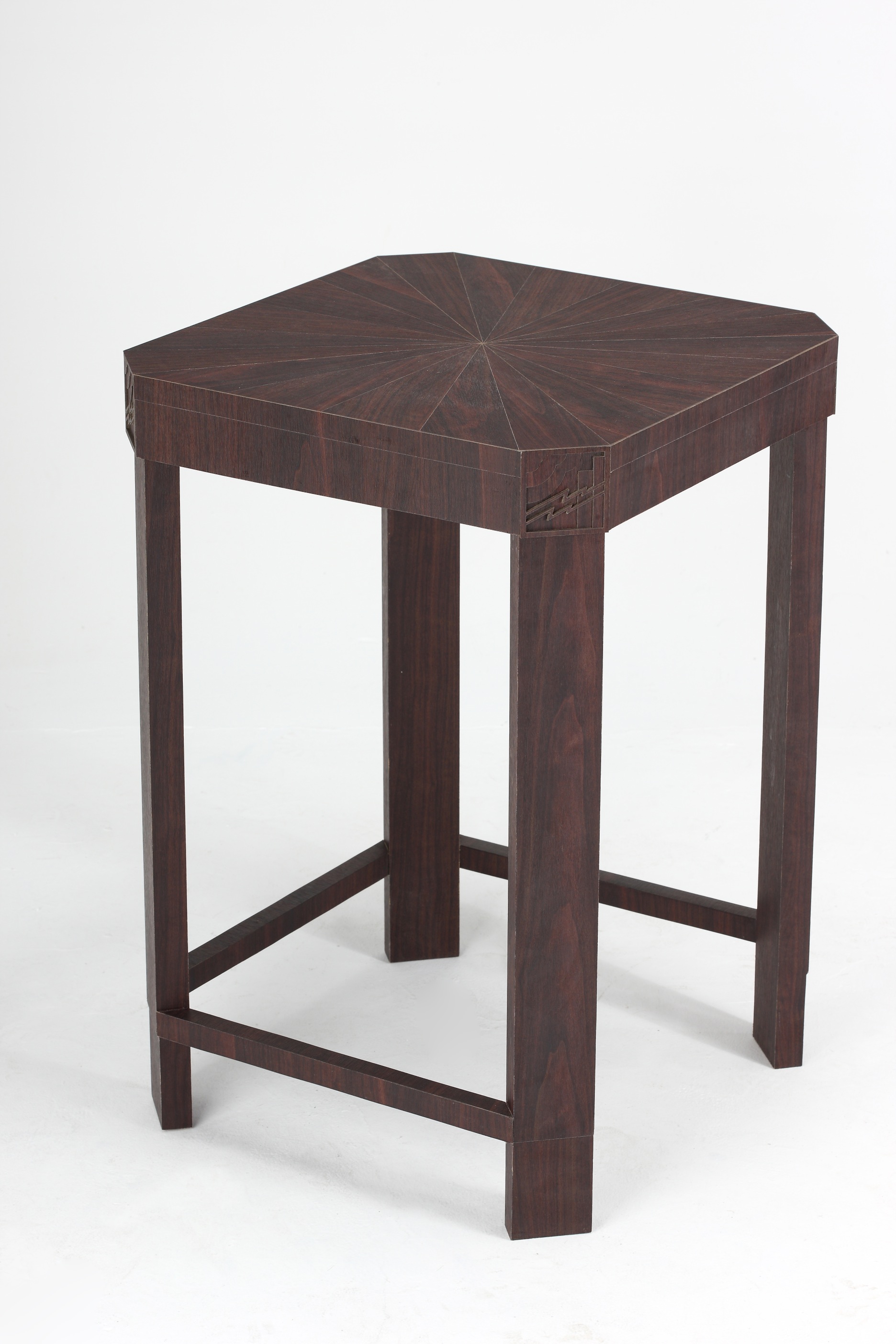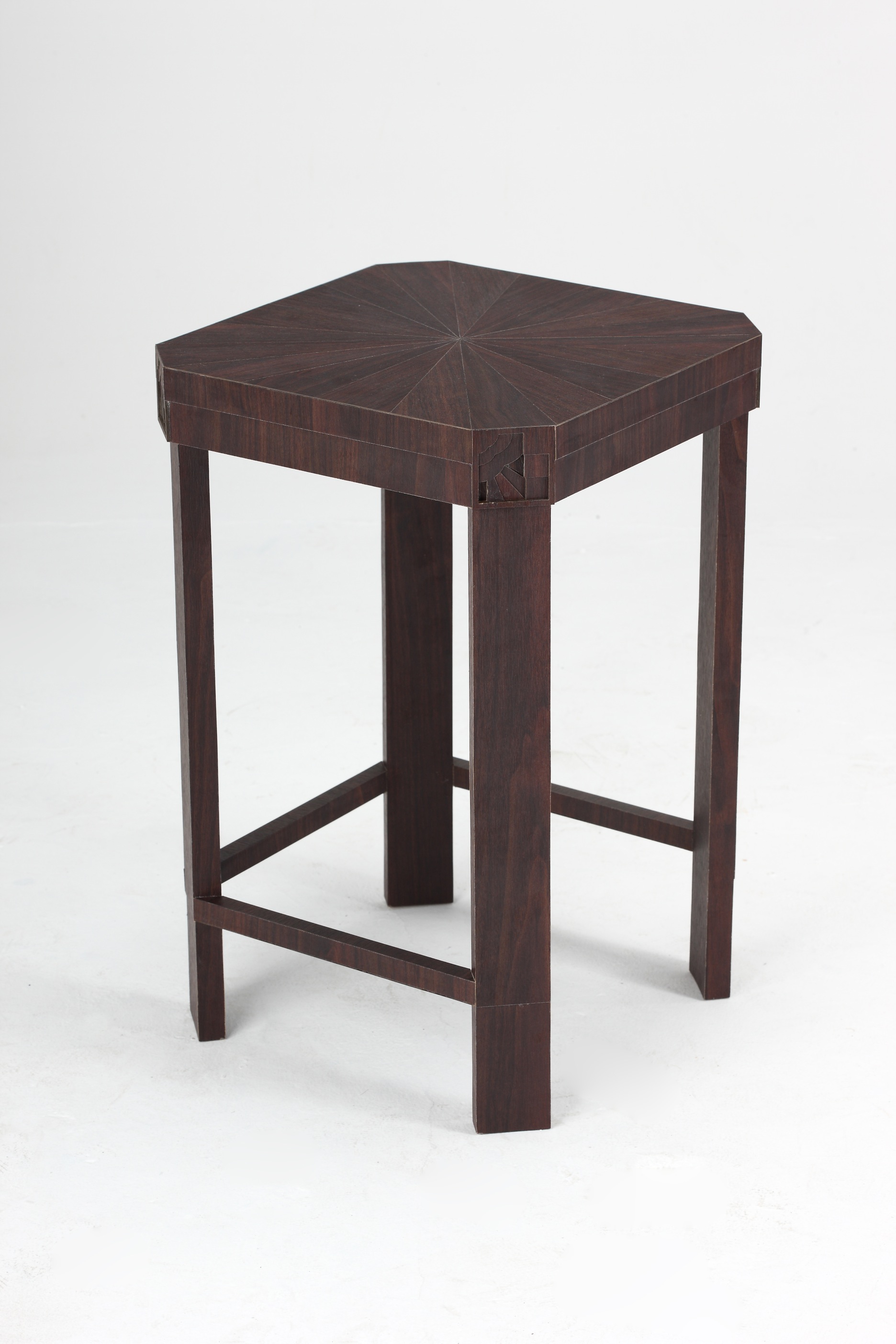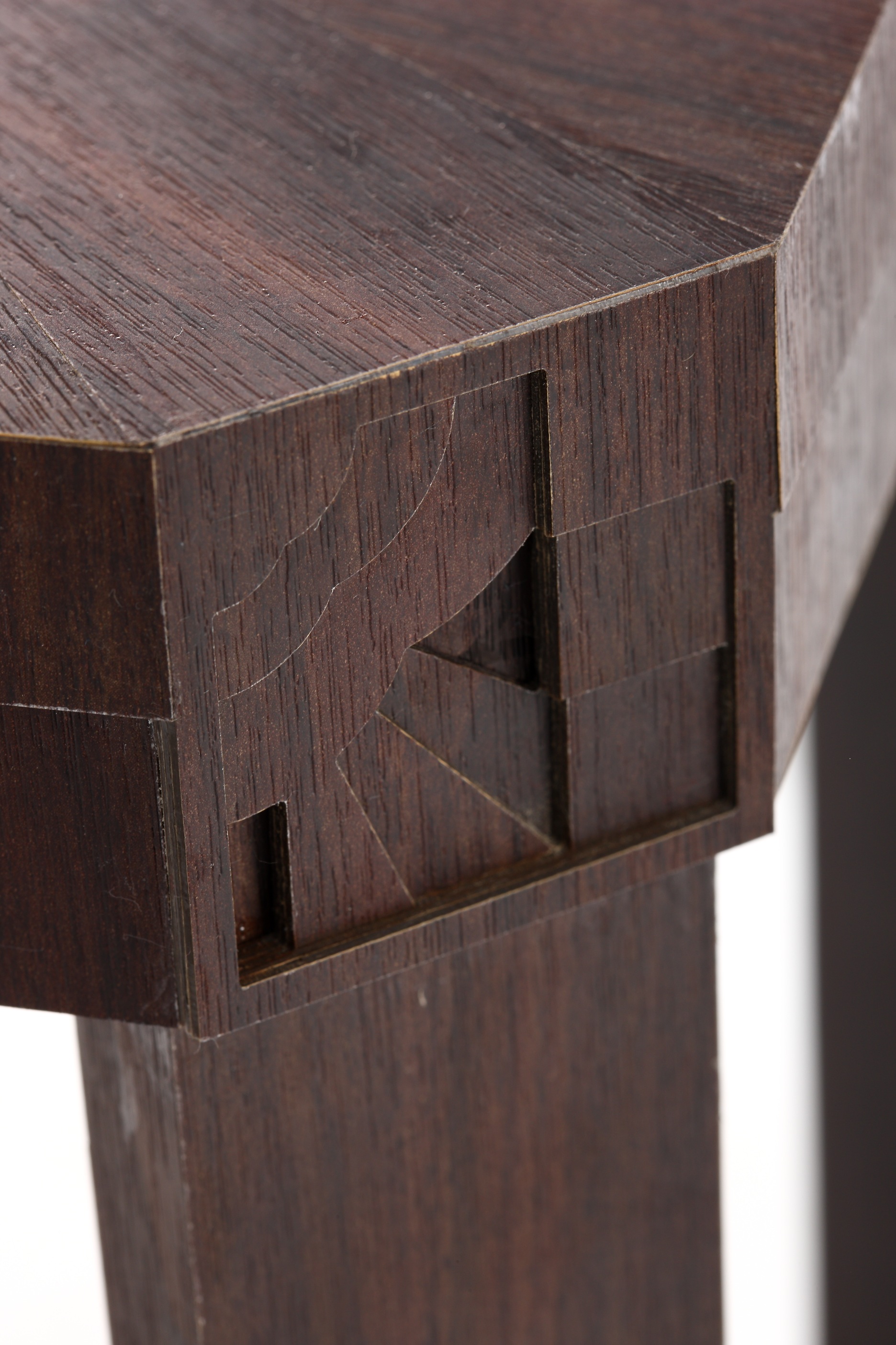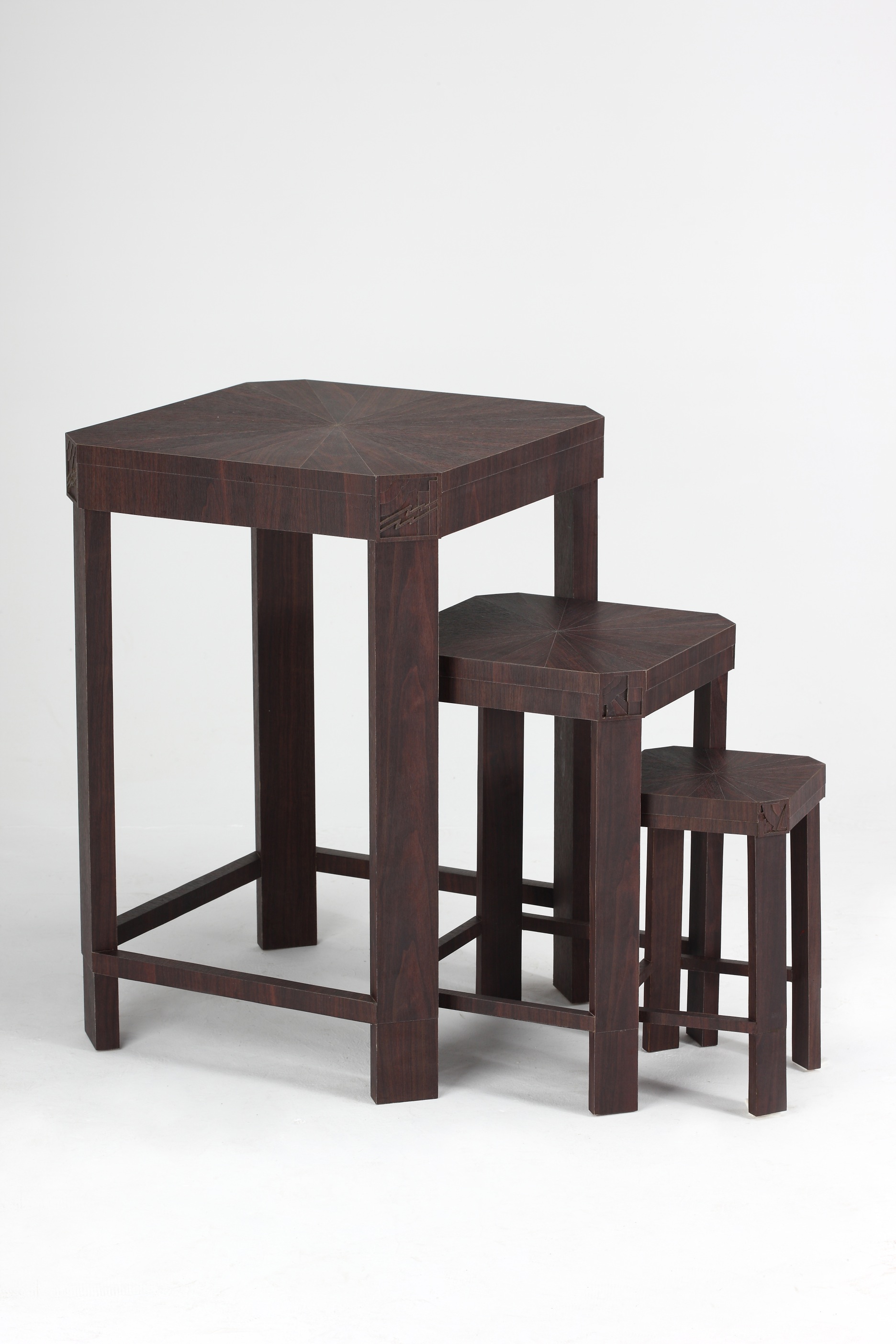 介绍:以30年代盛行的Art deco风格作为家具设计理念,沿袭原有的设计契形与装饰细节,用新的木纹贴面材料仿制老式实木套几,细节的装饰纹样灵感来自上海Art deco建筑的局部装饰浮雕.新的材料,老的契形,诞生了这套家具。
