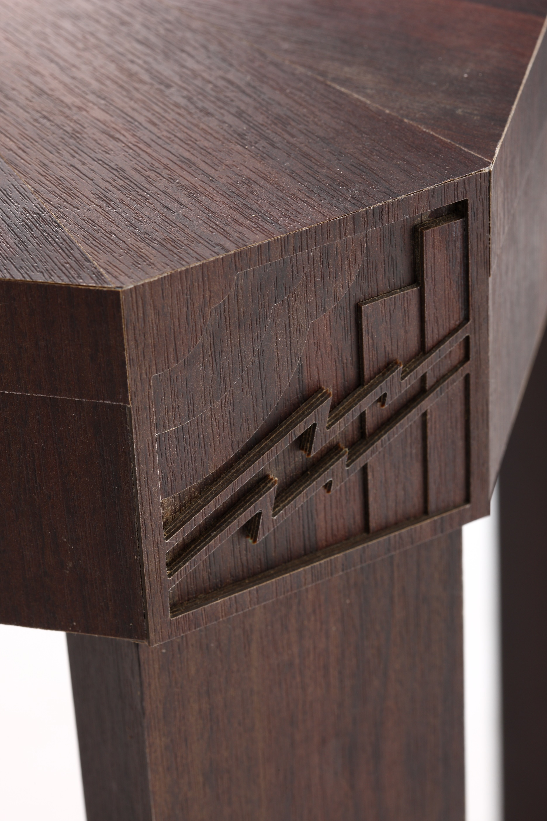 The idea comes from Art deco style which was popular in the 30’s. It follows its original design and decorative details. New generic wood veneer material is used to copy the old solid wooden table suit. The inspiration of decoration comes from local decorative relief on Shanghai Art deco buildings. New material, old style, leads to the birth of this furniture.