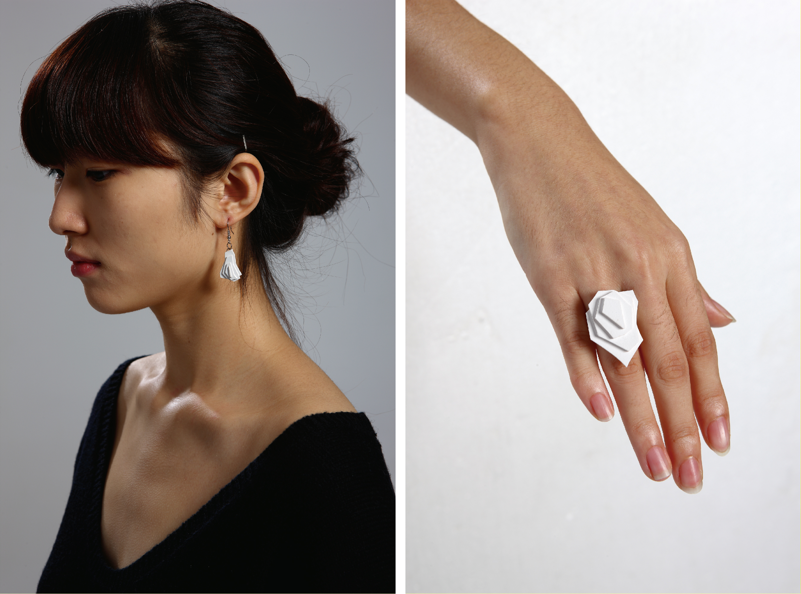 Take the Chinese mountain rocks as the main design element, the cutting laminated shape performs layer upon layer to overlap, thus constituting the sense of rocks. By reducing the odd structure of mountain rocks into jewelries, and wearing them on the collar, finger or ear lobe, you can feel aura of rocks melting into one point, where the beauty of rocks and people inosculate.