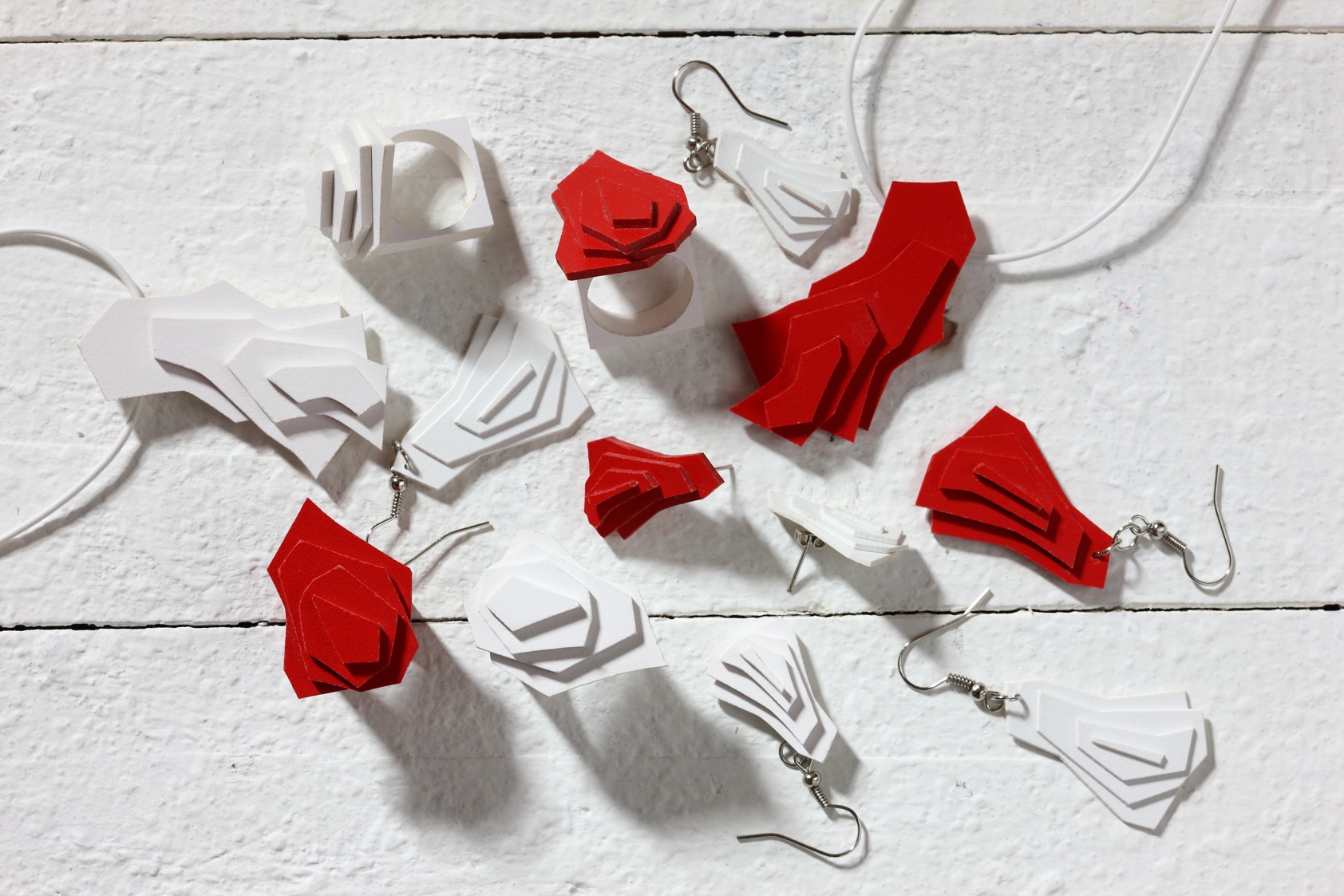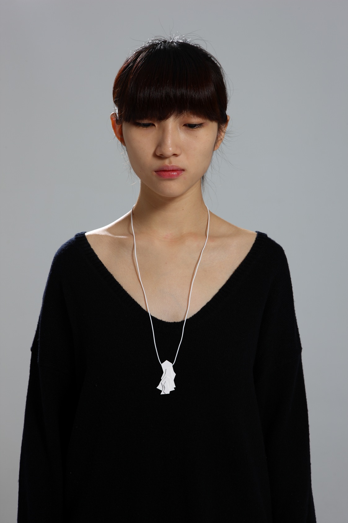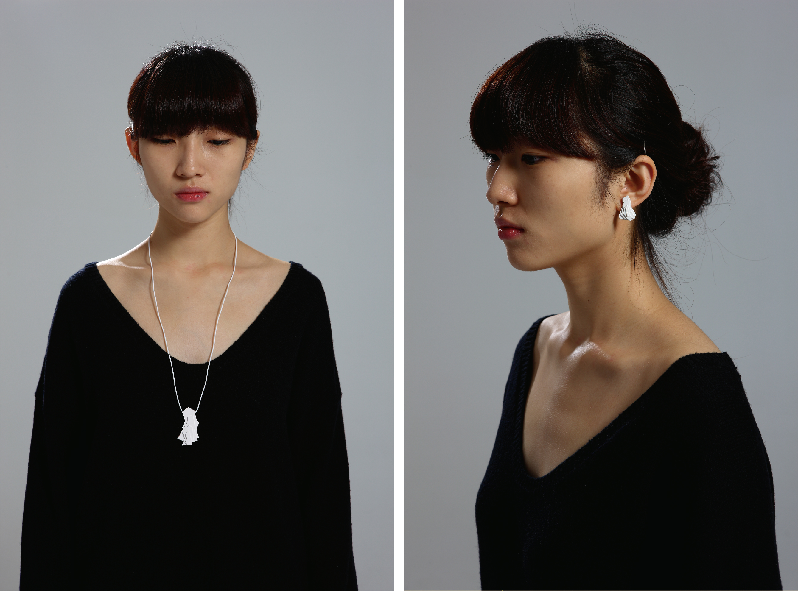 以中国山石作为主要设计元素,将材料切割成片状加以层层重叠,构成山石的语意。当奇山奇石的构造被缩小,成为饰品,配戴在颈间、指上和耳垂处,集山石之灵气融于一点,赏石赏人之美于一处。
